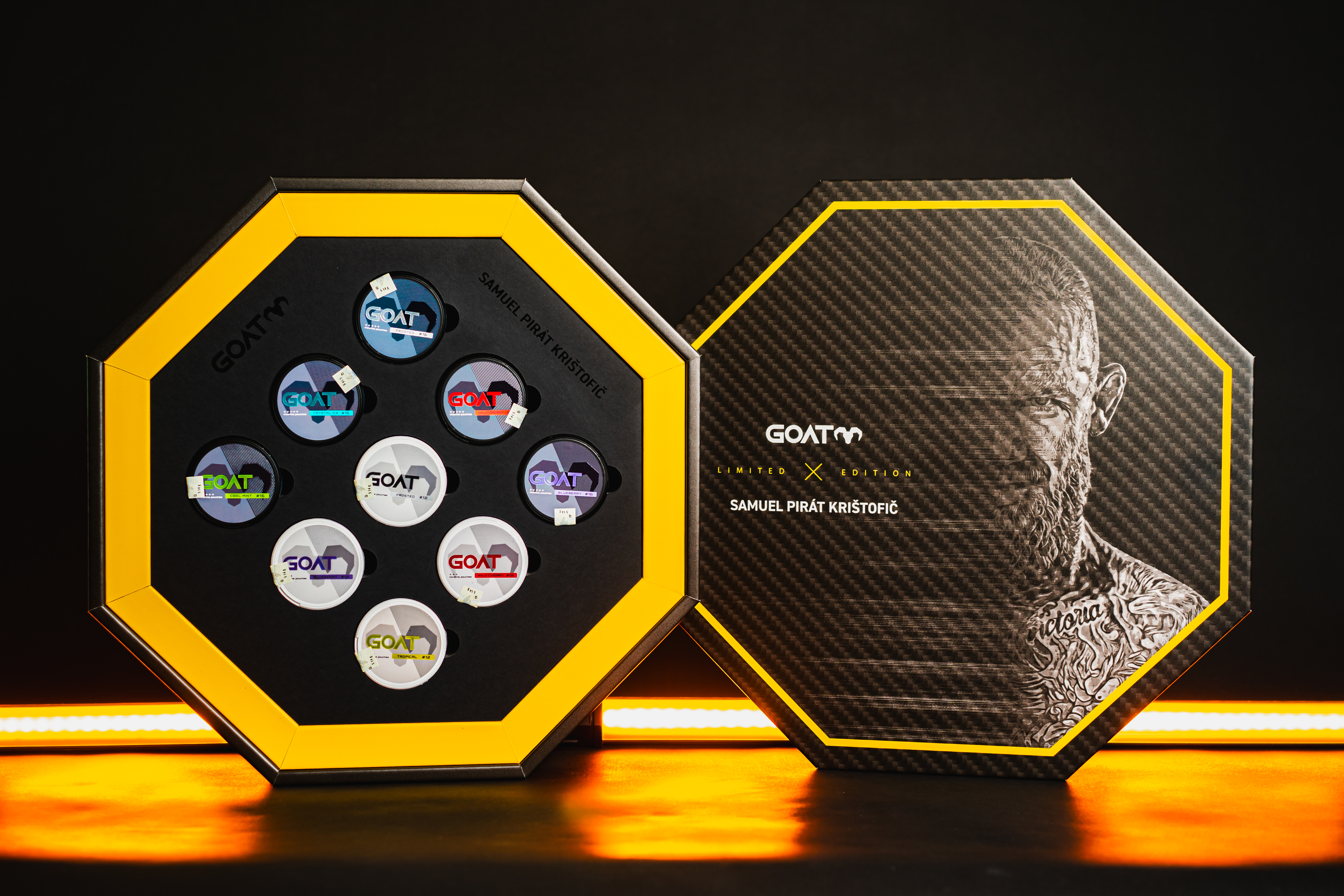Připravili jsme si pro Vás tuhle speciální limitku, která obsahuje všechny nikotinové sáčky GOAT. Tahle limitka nesmí chybět ve tvé sbírce ať už si fanda nebo přímo fighter. Naštěstí abys ji získal, nemusíš kvůli tomu do klece.